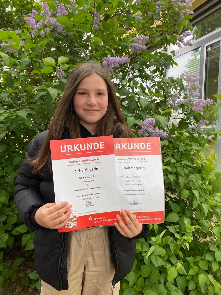 Am Montag, dem 08.05.23 traten unsere beiden Schulsiegerinnen des Vorlesewettbewerbs, Neyla Golchin aus der Klasse 4a sowie Afnan Noori aus der Klasse 4d, gegen andere Schülerinnen und Schüler im Stadtentscheid für unsere Schule an. Dabei wurde Neyla als „beste Vorleserin der Stadt Heusenstamm” gekürt. Für unsere Schule hat sie dazu noch einen Gutschein für die Schulbücherei abgeräumt.
